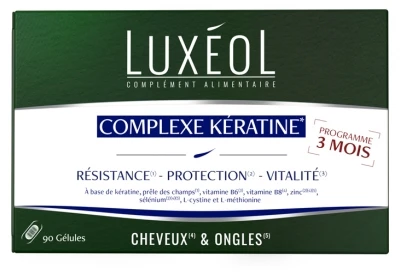 Luxéol Keratin Complex Hair and Nails 90 Capsules is a dietary supplement in capsule form that promotes the fortification, protection and vitality of hair.