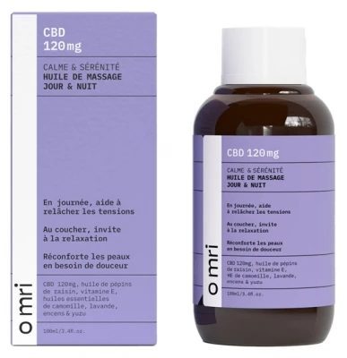 Omri CBD Day & Night Massage Oil 120mg 100ml is a concentrate of grape-seed oil, vitamin E and essential oils of chamomile, lavender, incense and yuzu, combined with CBD (120 mg).