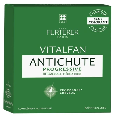 René Furterer Vitalfan Progressive Anti Hair Loss 30 Capsules is a food supplement to reduce hair loss from hormonal or hereditary origin.