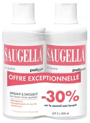 Saugella Poligyn Intimate Cleansing Care 2 x 500ml is a gentle cleansing care with neutral pH specially developed for intimate hygiene contains Chamomile extracts and Bisabolol that helps to relieve the disagreements and itching associated to dryness of vulvar area often present in menopause period or when the vaginal pH is more acid.