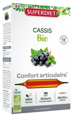 Superdiet Organic Blackcurrant 20 Phials is a blackcurrant-based food supplement known to contribute to the proper functioning of the joints, and to participate in the maintenance of joint mobility and joint comfort.